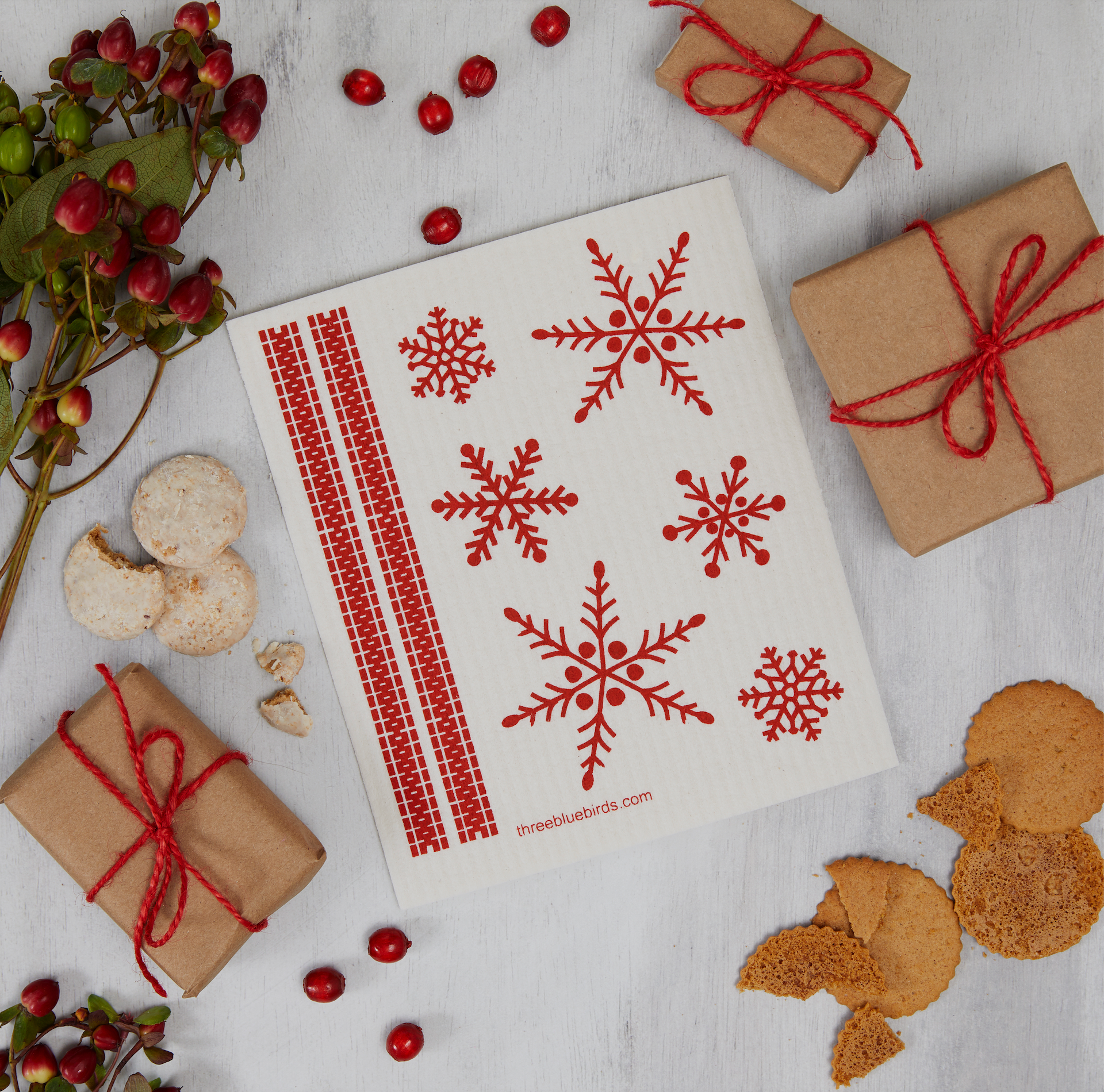 A Holiday, Winter + Christmas favorite! REDUCE WASTE with our Swedish Dishcloth – it’s sustainable, sturdy, and stylish. Each cloth absorbs 20x its weight, replaces 17 rolls of paper towels. ---- CONTENTS: 70% cellulose (FSC-Certified). 30% organic cotton (FairTrade & GOTS). Screen printed with water-based inks. 100% biodegradable. Designed & printed in Connecticut ---- USE: Wash dishes. Wipe up spills. Clean mirrors. Use streak-free on most surfaces. Air dries fast, doesn’t breed bacteria like a sponge. ---- REUSE: Wash up to 200 times, in top rack of dishwasher or in washing machine. Sterilize in microwave or boil briefly. ---- We include one FREE sign with your first order. Our hand made pine wooden display box holds 75 pieces and fits this sign. Box available on our product page for $29 (see image #2). ---- We donate 1% of revenue to the Earth for each dishcloth purchased, as a “1% for the Planet” business. CLEAN LIFE. GREEN PLANET. MADE WITH LOVE.